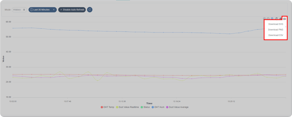 After your device is connected to our platform, all the data collected by your device's telemetry sensors will be automatically uploaded and displayed on the GRAPH page as a line chart. However, you can also create a widget to display telemetry data or multiple telemetry data points on the Dashboard menu.