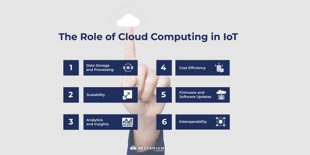 The role of cloud computing in IoT is crucial and multifaceted, providing a range of services and capabilities that enhance the functionality, efficiency, and scalability of Internet of Things (IoT) deployments. Here are some key roles of cloud computing in the context of IoT:Â