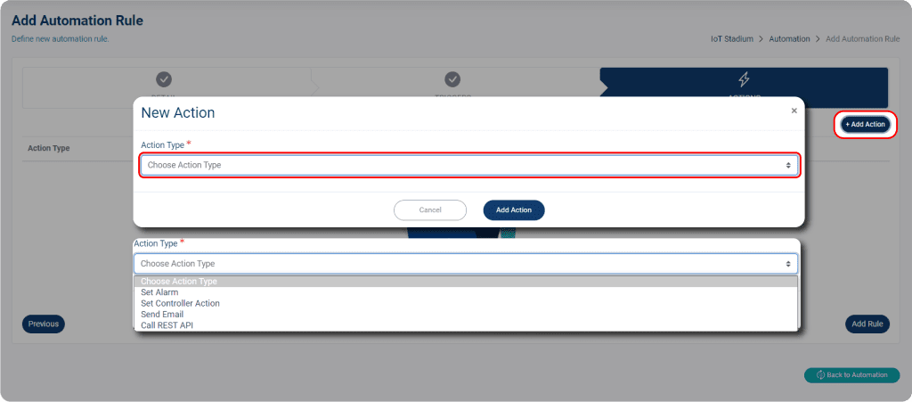 Once you've set up your triggers or schedules, the next step is to specify the action for your newly created automation rule. You have several types of actions to choose from, including Set Alarm, Set Controller Actions Send Email, and Call REST API. Please note that the only available action for Schedule automations is to Set Controller Actions. However, if you choose either Telemetry Trigger or Controller Trigger, you will have access to all available action types.