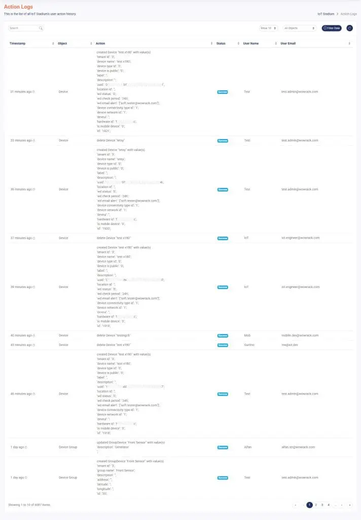 This page contains a list of all the activities that took place in your tenant. You could see the timestamp of the activity on timestamp column, the type of activity, the status, and the user who executed the action.