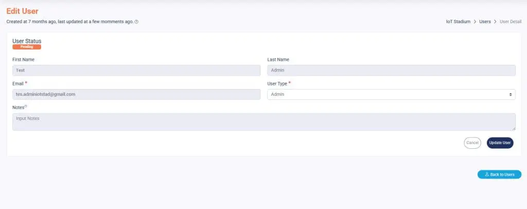 You can create and manage various user roles with distinct access levels and responsibilities in IoT Stadium thanks to its multi-tenancy architecture. Tenants, Admins, and Users are the three primary categories of users. Each type has different levels of access within the platform and distinct authorities.