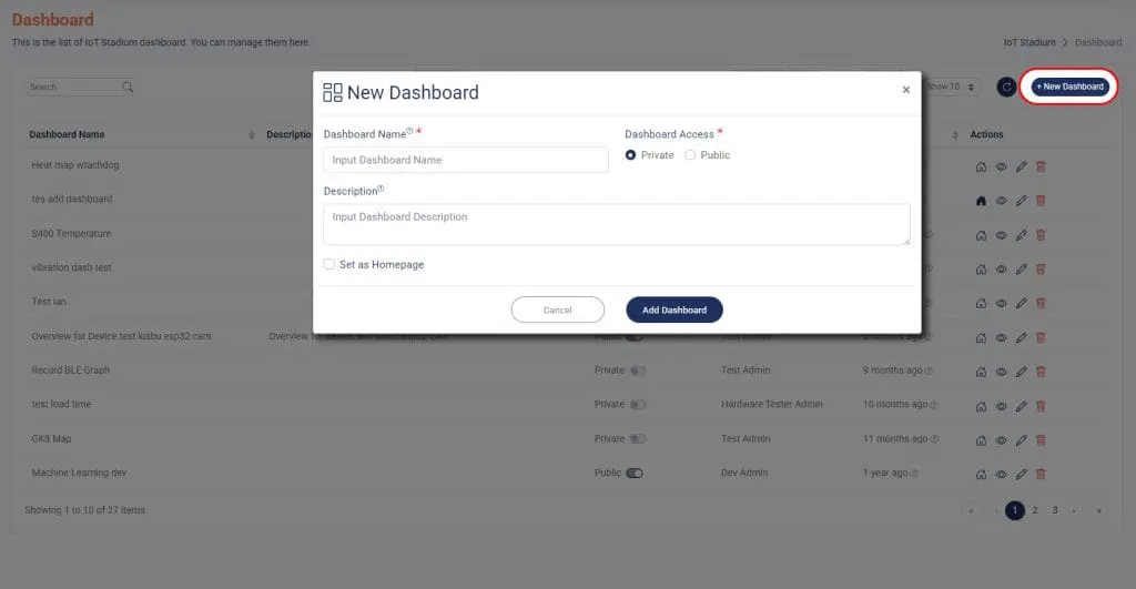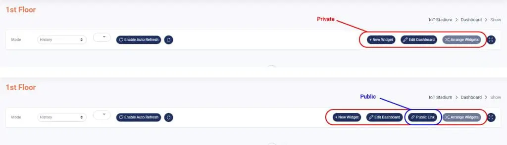 The Dashboard Access option allows you to set a restriction for your dashboard. When you set the access to Private, it is accessible only to you and all users in the same tenant as you. When the dashboard access is set to Public, you could share the link of your dashboard to anyone who has an IoT Stadium account.