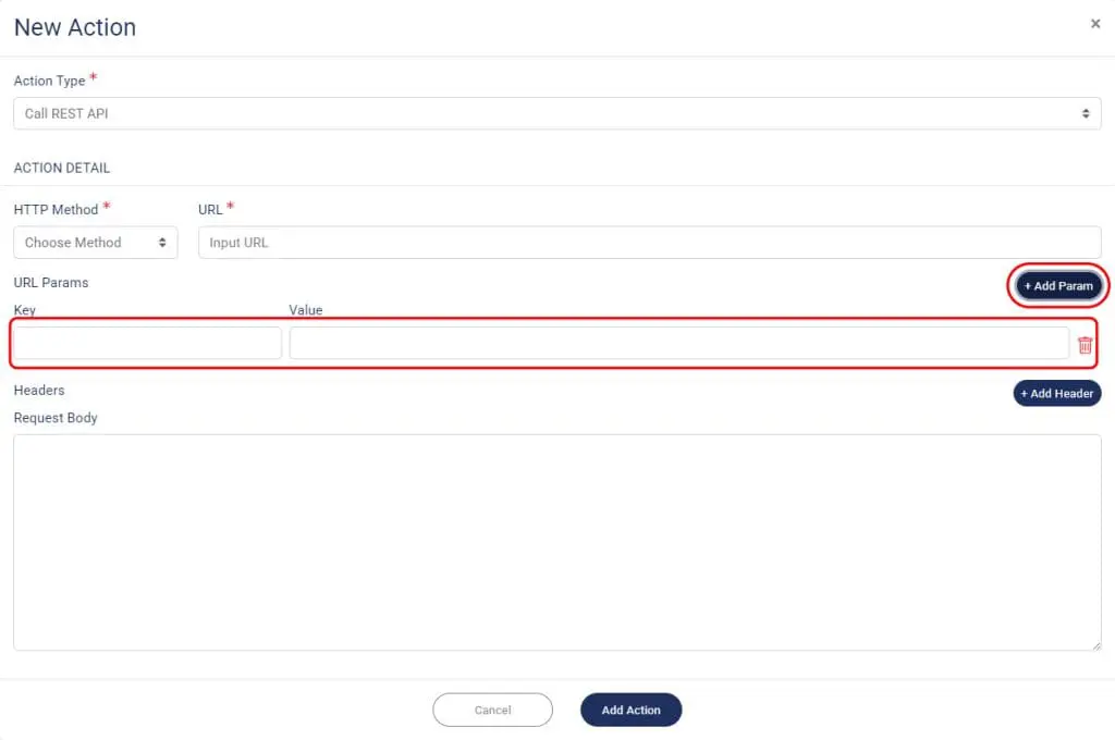 3. If you want to add the parameter for your URL, click on Add Param. You could also add for more than one URL parameter. Then fill the Key and the Value for your parameter.