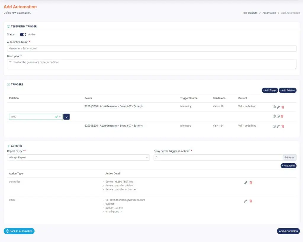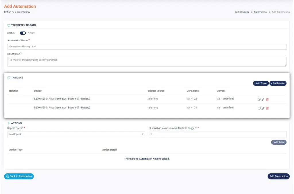 Imagine you want to set a limit for a telemetry value, and when that limit is reached, you want an action to occur—like triggering an alarm or automatically activating another device to handle the situation. In such cases, you can use this type of trigger.