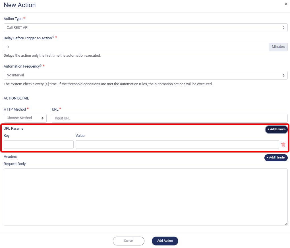 - If you want to add the parameter for your URL, click on Add Param. You could also add for more than one URL parameter. Then fill the Keyand the Valuefor your parameter.