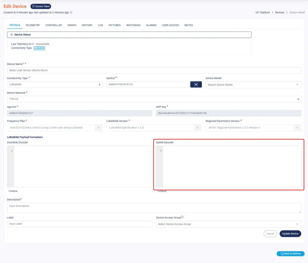 Once it done, your device is already added to the platform, but you still need to set the payload formatter. Here are some short explanations: