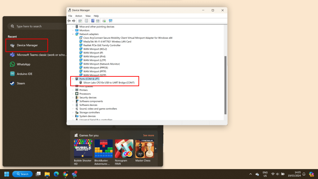 3. To understand on which COM port your USB is connected you can open Device Manager.