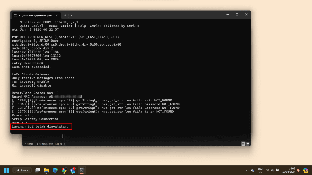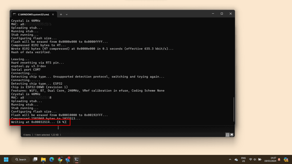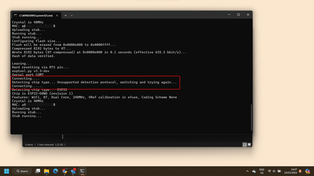 10. If the installation isn’t started yet and the CMD window still display 'Unsupported detection protocol, switching and trying again...' push the BOOT button on your device so the chip can be detected.