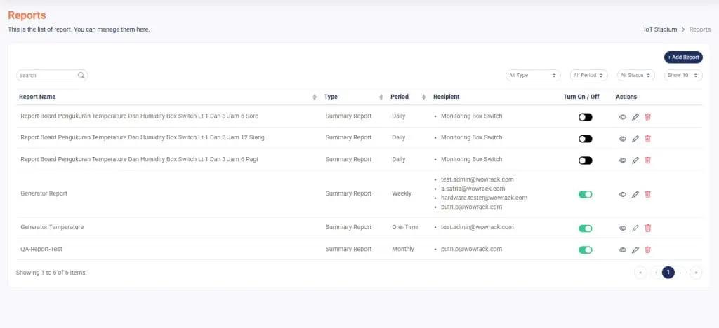 This page contains a list of reports that you have made for your tenants. The frequency of the report is shown in the period column. You may also be able to click the button in the turn on/off column to turn the report on or off. Additionally, you can view the list of users who receive the reports.