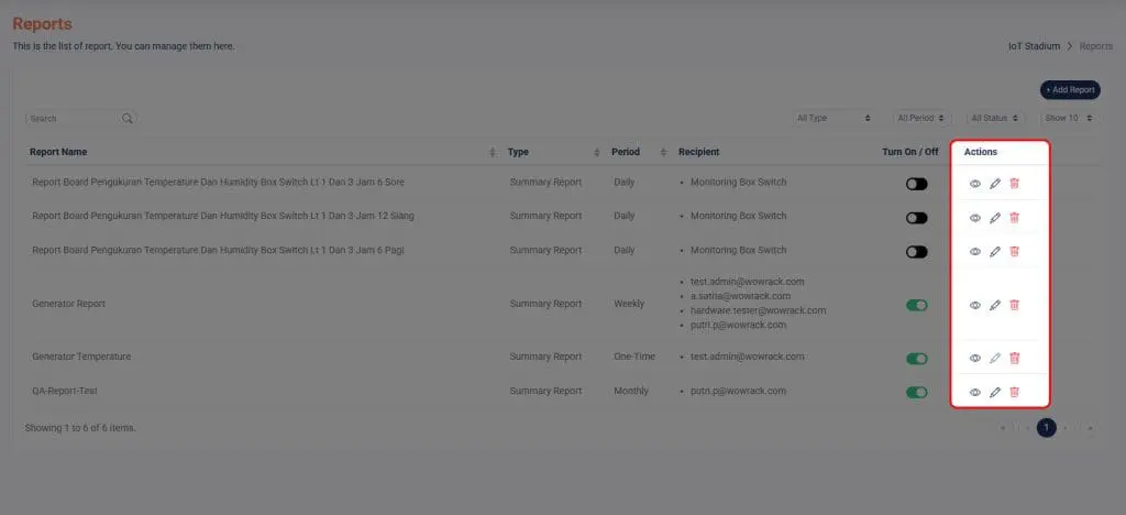 This page contains a list of reports that you have made for your tenants. The frequency of the report is shown in the period column. You may also be able to click the button in the turn on/off column to turn the report on or off. Additionally, you can view the list of users who receive the reports.
