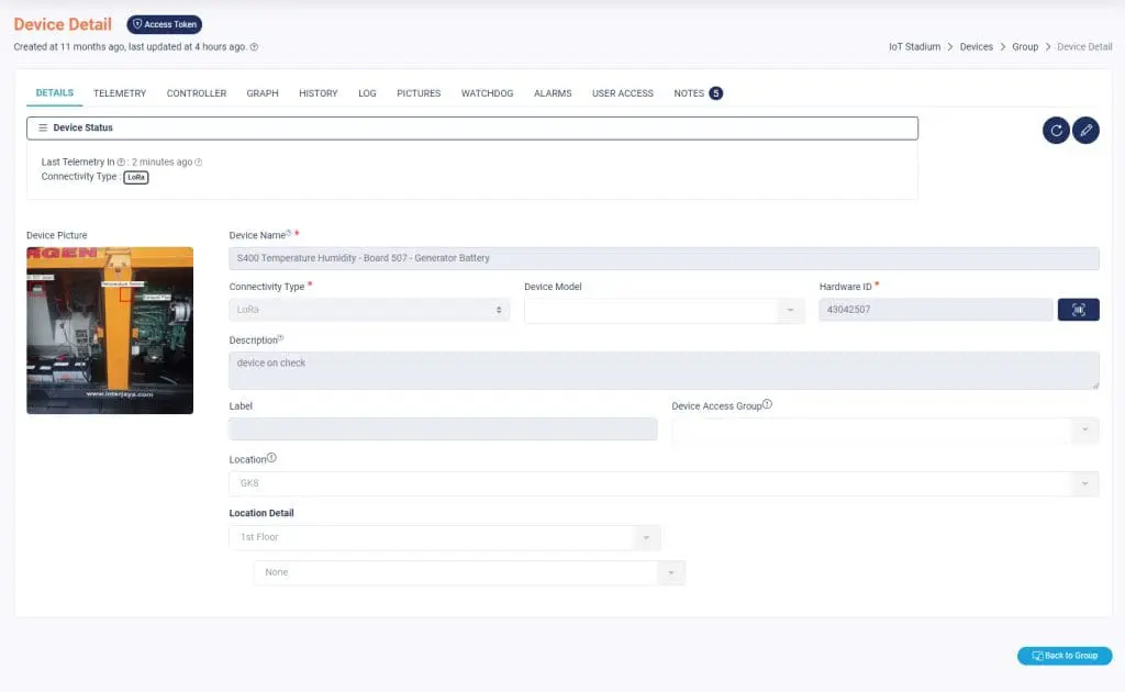 This page will contain all the details about your device. From its Name, selection of Connectivity Type, selection of Device Model, Hardware ID, Description, Label, Device Access Group, Location and Location Detail.