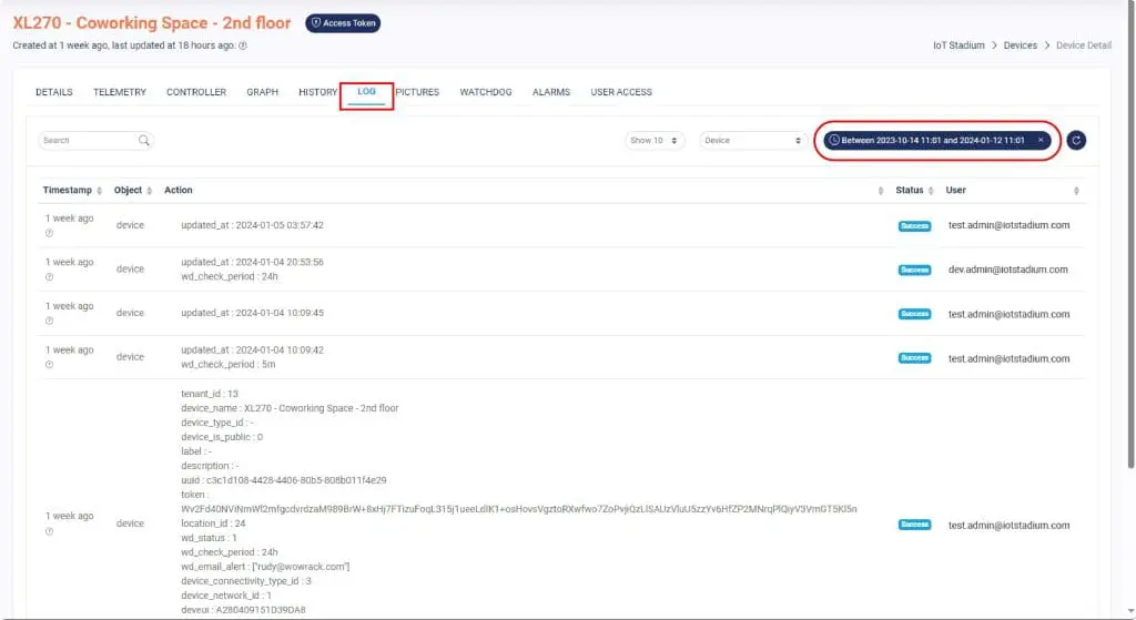 On the Log Tab, you can see the list of the log or activity of your selected device. On the first page, you will see the default view of this page, which shows events from the past three months prior to the moment you click on the Log tab.