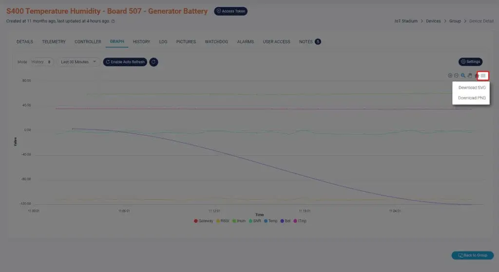 In Graph tab, you are able to monitor and download the data from your telemetries.