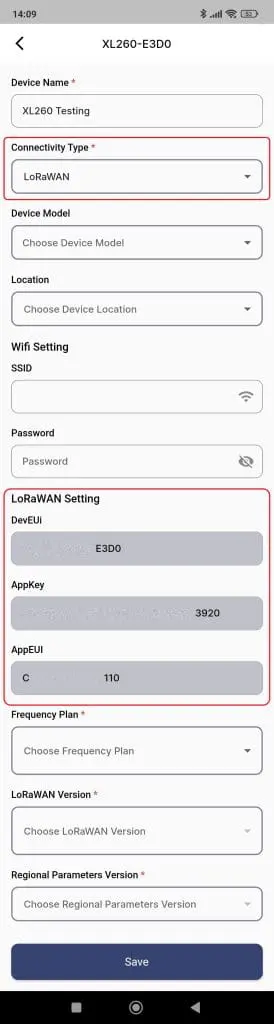 10. Once you chose LoRaWAN, the DevEUI, AppKey, AppEUI, will be automatiically added to the platform.