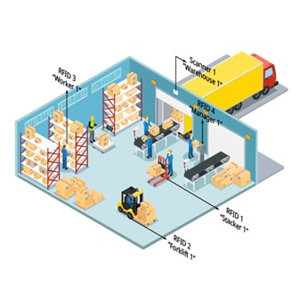RFID (Radio Frequency Identification) memungkinkan pelacakan barang tanpa perlu pemindaian manual satu per satu. Tag RFID dapat dipasang pada barang maupun kartu pegawai, sementara sistem pemindari bisa ditempatkan di pintu masuk, rak, atau area tersembunyi. Teknologi ini memungkinkan pelacakan real-time tanpa harus mengandalkan pengawasan visual, dan data yang terkumpul bisa dimanfaatkan untuk optimalisasi layout gudang di masa depan.