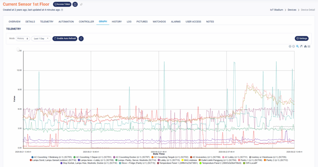 Contohnya bisa dilihat pada grafik pada platform IoT Stadium yang menampilkan data secara historis. Line chart kami pilih agar para pengguna bisa melihat data lebih mudah. Selain itu, nantinya Anda melakukan seleksi ke salah satu data/ telemetry, untuk melihatnya lebih detail.
