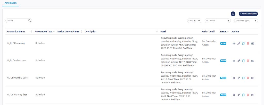 Optimalkan pengoperasian operasional kantor Anda dengan mengotomatisasi perangkat berdasarkan jadwal kerja para karyawan. Dengan automasi ini, Anda dapat menetapkan konfigurasi yang untuk menghidupkan perangkat-perangkat utama—seperti lampu, atau AC—tepat sebelum jam kerja dimulai, dan mematikan perangkat tersebut secara otomatis beberapa menit setelah jam kerja berakhir.