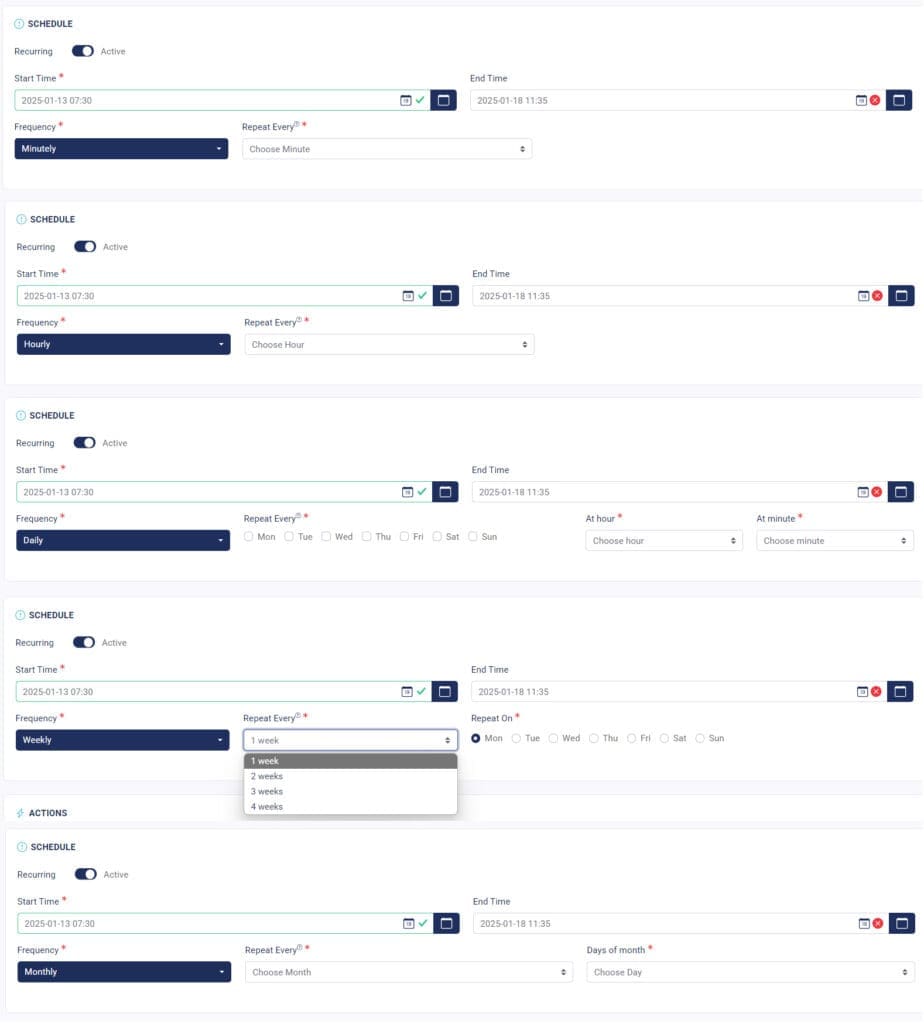 4. Each Frequency has its own Repeat Every, set it to make your schedule recurrent.