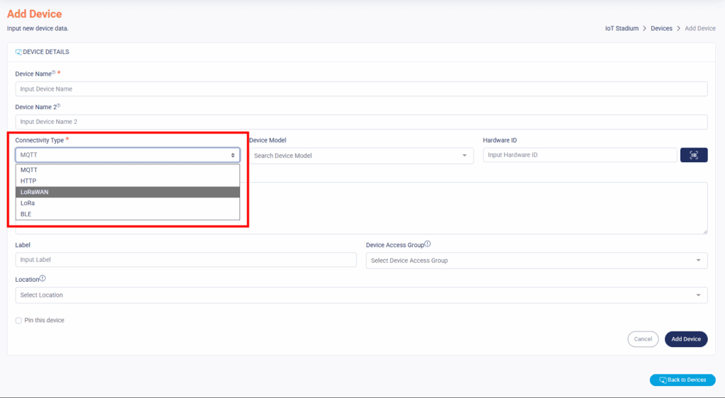 If you choose LoRaWAN, make sure to add a new LoRaWAN gateway first—especially if you haven’t added one yet in the IoT Stadium platform.