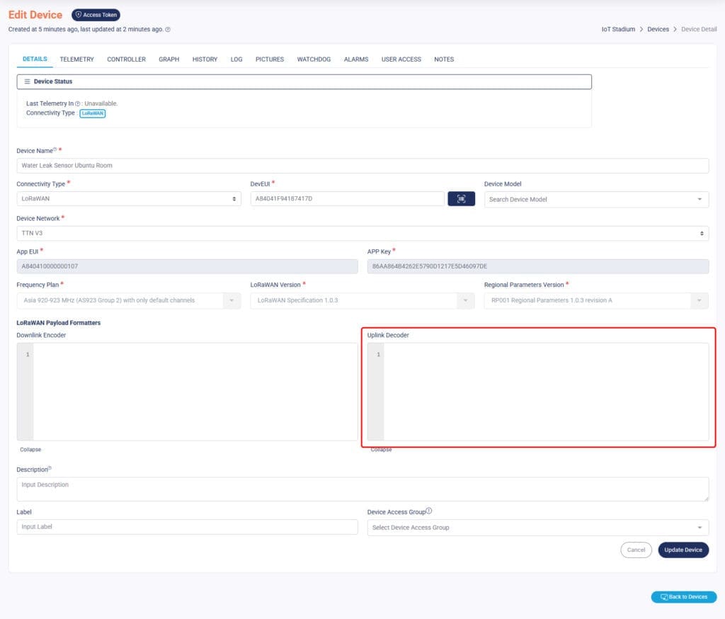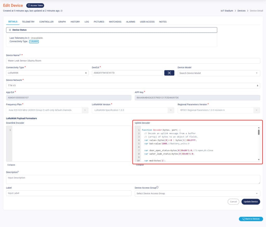 Once it done, your device is already added to the platform, but you still need to set the payload formatter. Here are some short explanations: