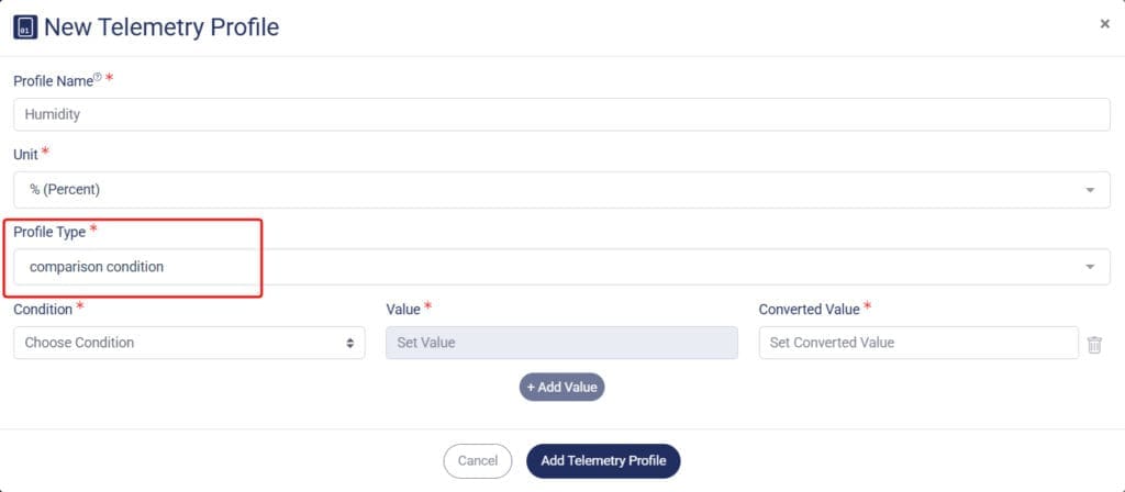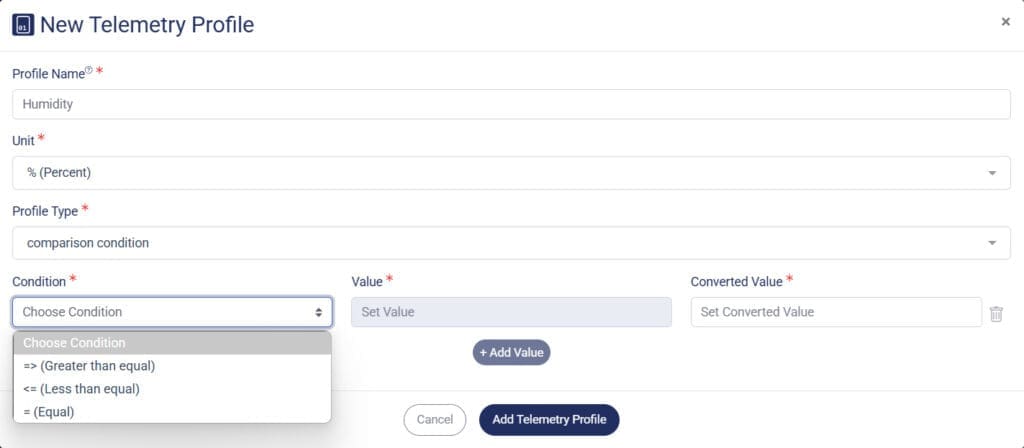 Let’s say you want to limit a sensor value, use this option to apply a comparison condition, which converts the measurement scale when a specific threshold is reached.